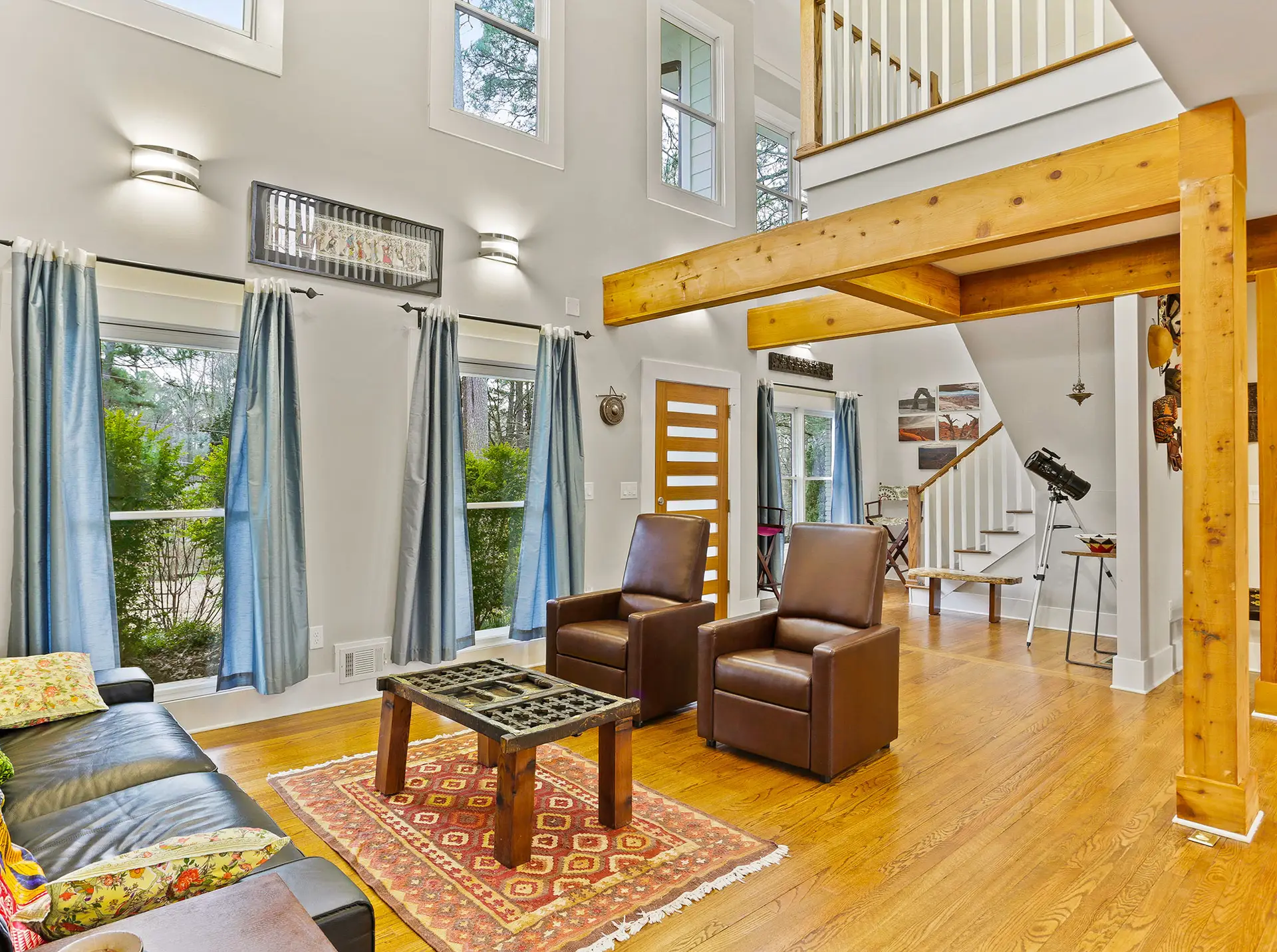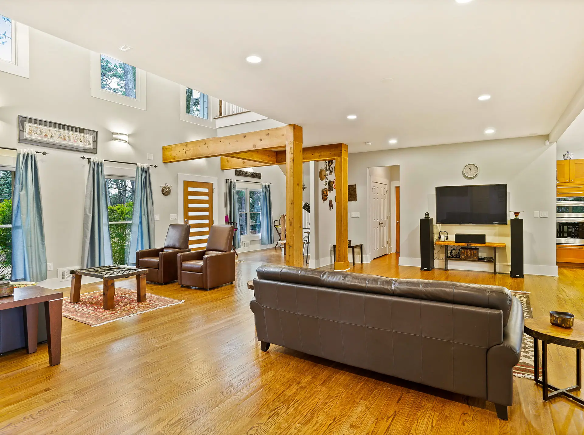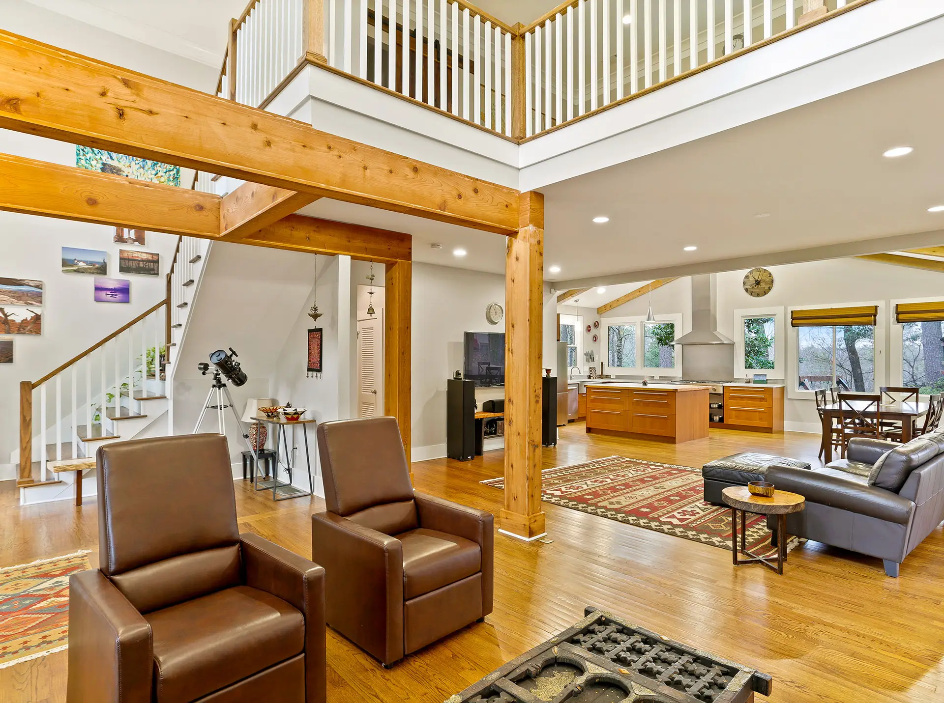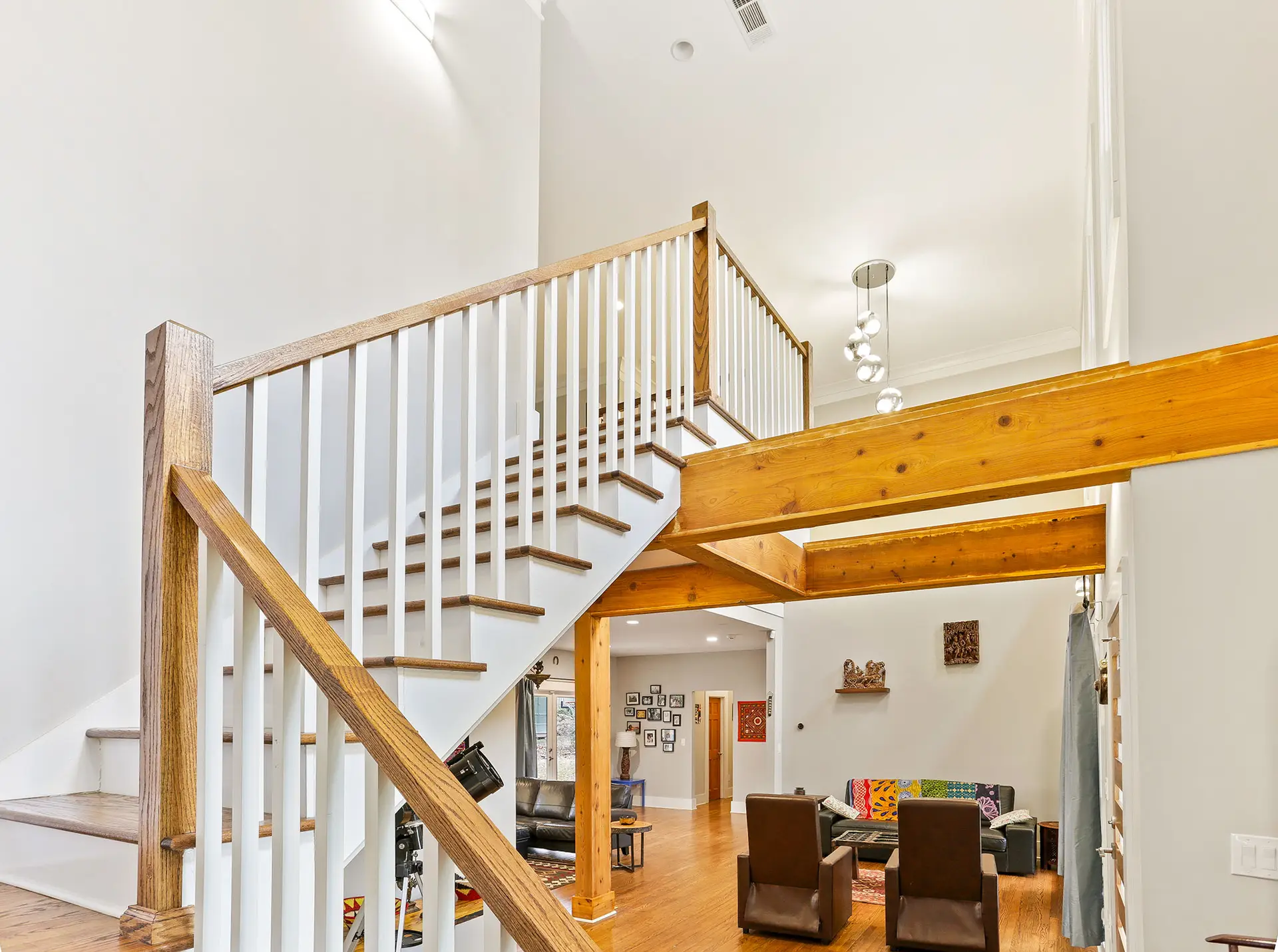 The design of the home incorporated a whole new second floor and a reorganization of the main level. The exterior design has ties to the prairie style, but leans more heavily towards a contemporary interpretation. Many of the interior walls of the home were removed, creating a more open floor plan. Heavy wood beams provide both support for the stair landing and provide a unique, exposed architectural expression of the structure.