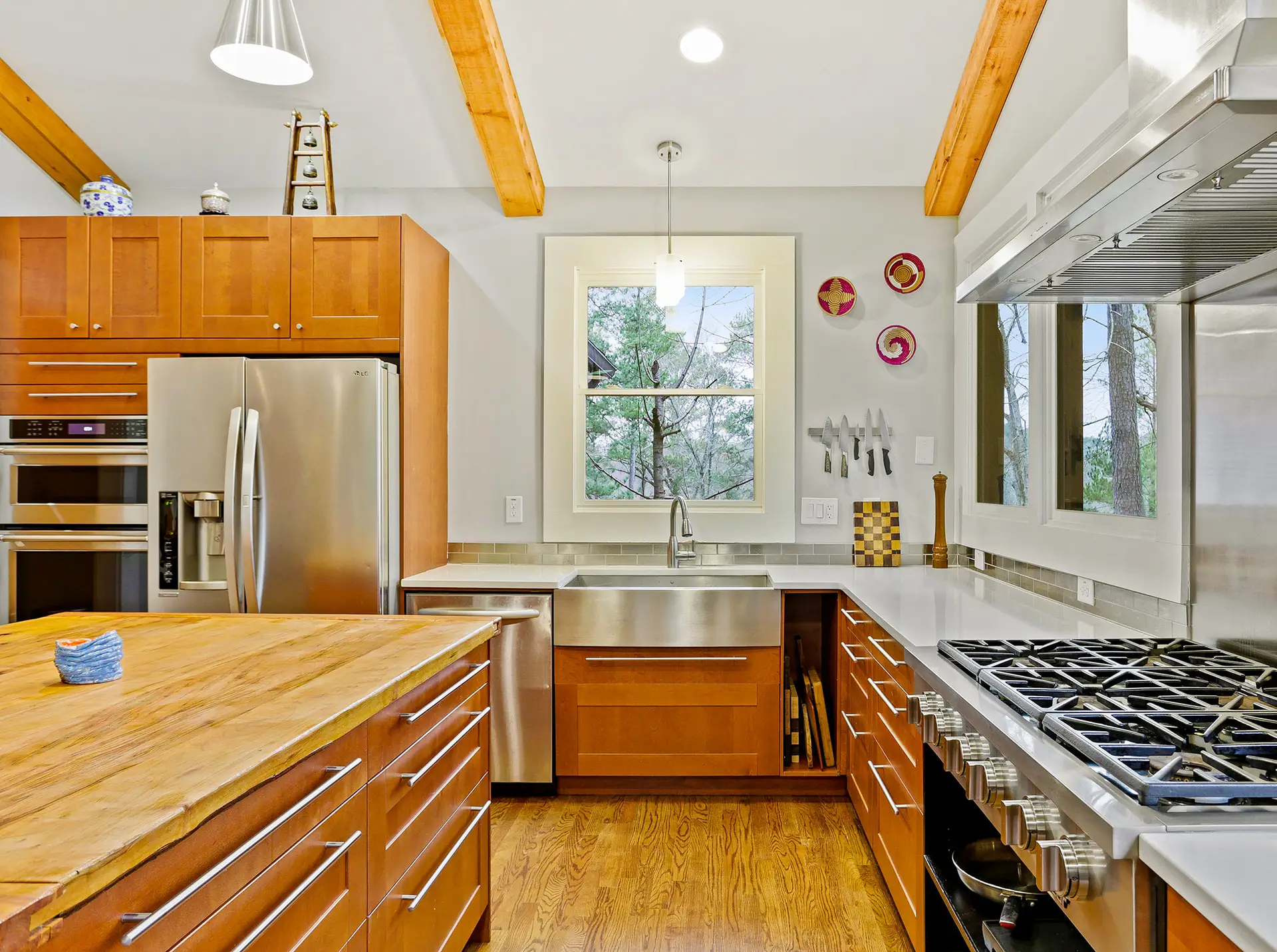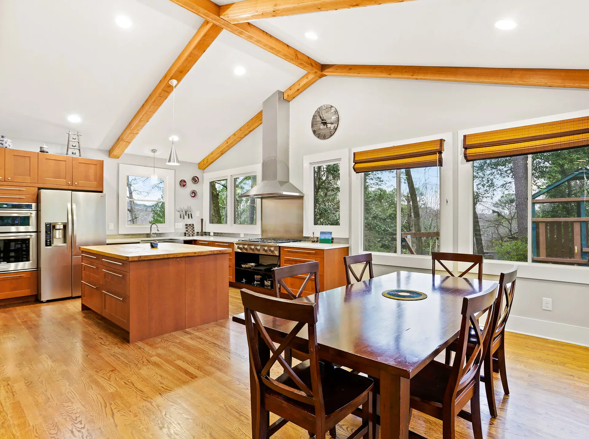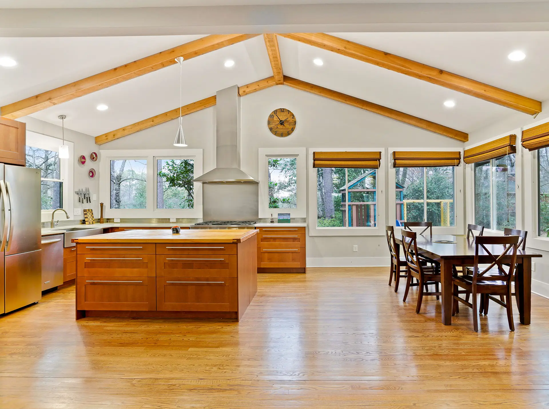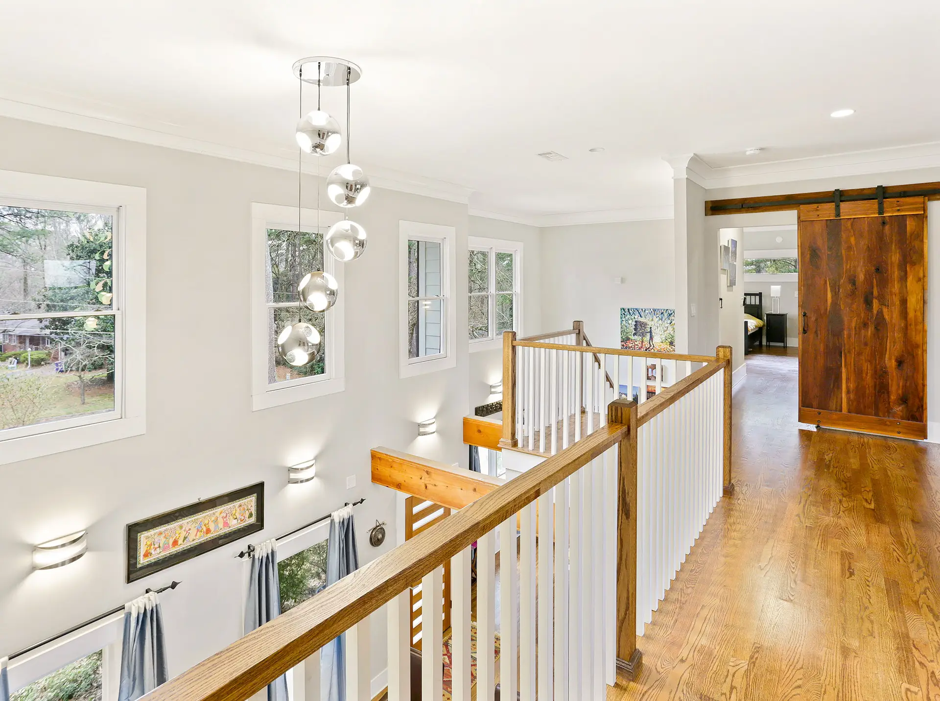 The design of the home incorporated a whole new second floor and a reorganization of the main level. The exterior design has ties to the prairie style, but leans more heavily towards a contemporary interpretation. Many of the interior walls of the home were removed, creating a more open floor plan. Heavy wood beams provide both support for the stair landing and provide a unique, exposed architectural expression of the structure.